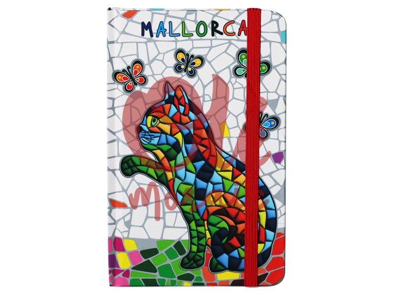 Libreta de 80 hojas con un diseño colorido de un gato, inspirada en la arquitectura y el arte de Mallorca. La cubierta presenta un vibrante mosaico con un gato en tonos rojos, azules, verdes y amarillos, rodeado de mariposas que le dan un toque alegre. Este producto cuenta con una banda elástica roja para mantener la libreta cerrada, lo que la hace perfecta para escribir y llevar un pedazo de la cultura mallorquina a cualquier lugar.