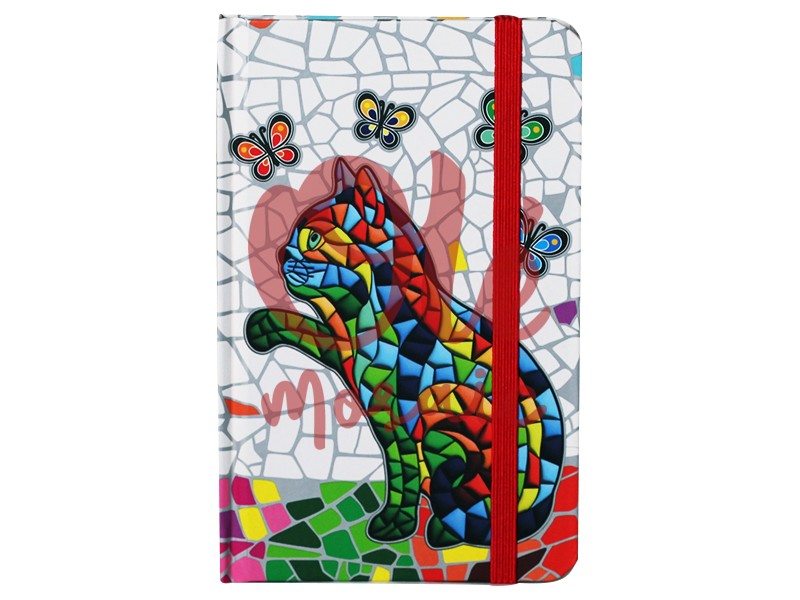 Libreta de 80 hojas con un diseño colorido de un gato, ideal para amantes de los animales y del arte. La cubierta muestra una vibrante ilustración de un gato en mosaico, con brillantes tonos verdes, azules, rojos y amarillos, enmarcada por un fondo blanco con detalles de mariposas. Un práctico cierre elástico rojo asegura que tus anotaciones estén siempre protegidas. Perfecta para el uso diario o como un regalo original.