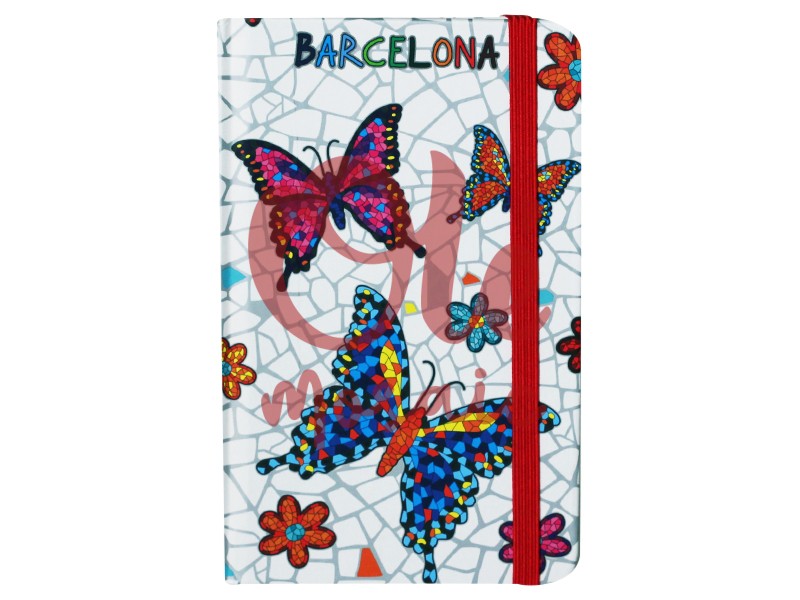 Libreta de 80 hojas decorada con coloridas mariposas y flores, inspirada en el estilo del mosaico de Gaudí en Barcelona. La cubierta presenta un diseño vibrante, con mariposas en tonos azules, rojos y amarillos sobre un fondo de mosaico blanco y gris, evocador del modernismo catalán. Este artículo, ideal para tomar notas y hacer bocetos, cuenta con un práctico cierre elástico rojo, que añade un toque de color y funcionalidad.