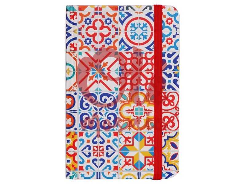 Libreta de 80 hojas decorada con un vibrante diseño de mosaicos, inspirado en la rica tradición artística de España y Portugal. La cubierta presenta un colorido patrón que combina elementos geométricos y florales en tonos azules, rojos, amarillos y blancos, evocando los célebres azulejos de las plazas y edificios históricos. Con un acabado brillante y una práctica banda elástica roja, esta libreta es ideal para anotar tus ideas y recuerdos con un estilo distintivo y cultural.