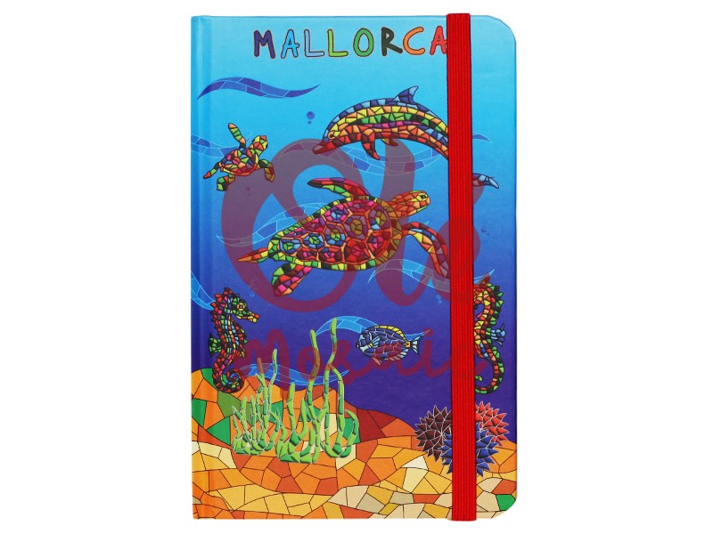 Libreta de 80 hojas decorada con vibrantes motivos marinos, que evocan la belleza del entorno acuático de Mallorca. La cubierta presenta un diseño colorido con tortugas, delfines y caballitos de mar al estilo mosaico, rodeados de algas y sobre un fondo azul intenso. Este artículo, además, cuenta con un cierre elástico rojo que le aporta funcionalidad y un toque atractivo. Ideal para llevar tus pensamientos y recuerdos de la isla.