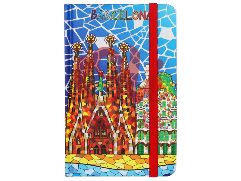 Libreta de 80 hojas con una vibrante panorámica de Barcelona, donde destacan la emblemática Sagrada Familia y la singular y colorida arquitectura del Park Güell. Su diseño incluye un espectacular mosaico en tonos azules, amarillos y naranjas, que representa la esencia artística de Gaudí. Con un práctico elástico rojo para cerrarla de forma segura, esta libreta ofrece un espacio ideal para tus notas y recuerdos de esta mágica ciudad.