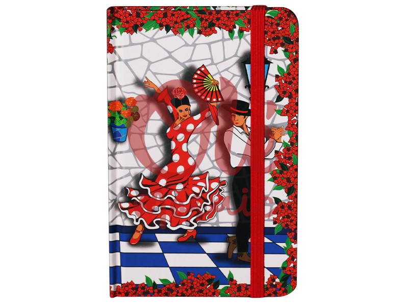 Libreta de 80 hojas decorada con una vibrante ilustración de un patio andaluz, donde una bailaora de flamenco con un vestido de lunares rojos y un elegante abanico celebra su arte en compañía de un bailaor. El diseño, enmarcado por flores rojas y un fondo de piedras blancas, evoca la esencia del folclore español. Con un cierre elástico rojo, esta libreta es ideal para tomar notas y guardar recuerdos, fusionando funcionalidad y belleza cultural.