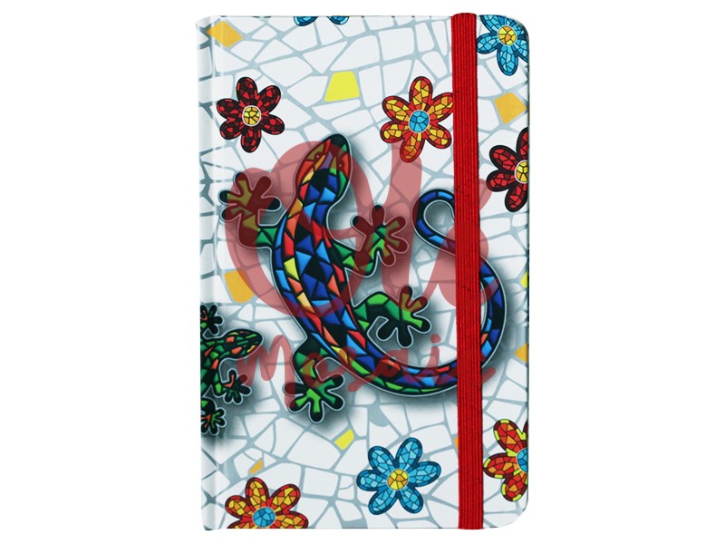 Libreta de 80 hojas decorada con una salamandra colorida sobre un fondo de mosaico, inspirada en el arte de Gaudí, típica de Barcelona. Su diseño vibrante incluye flores en tonos rojo, azul y amarillo, que realzan un estilo alegre y contemporáneo. La libreta cuenta con una banda elástica roja para mantenerla cerrada, ideal para capturar ideas y bocetos mientras evocas la esencia del modernismo catalán.