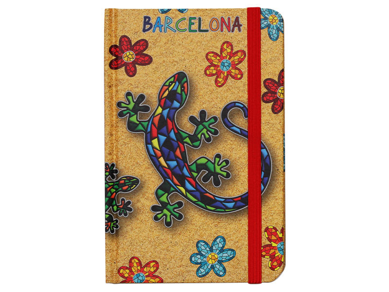 Libreta de 80 hojas con un colorido diseño de salamandras, inspirada en el arte barcelonés. La cubierta, con un fondo en tonos beis, presenta un vibrante mosaico que ilustra una salamandra rodeada de flores de diversos colores. La banda elástica roja asegura tus notas y, por su tamaño práctico, es perfecta para llevar a cualquier parte. Ideal para los amantes de la ciudad y su cultura.
