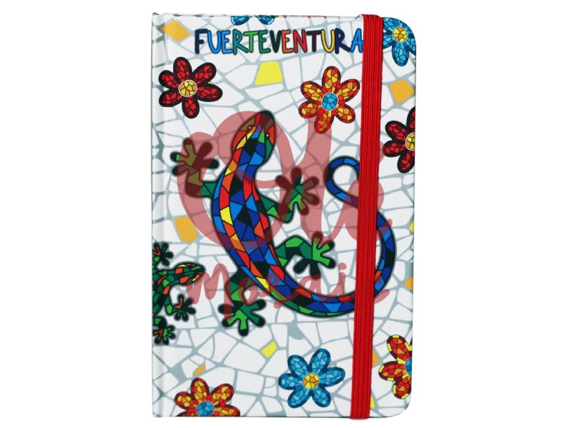 Libreta de 80 hojas decorada con un diseño vibrante inspirado en la fauna de Fuerteventura, donde destaca una elegante salamandra en tonos brillantes de verde, rojo y azul. El fondo presenta un mosaico de colores con flores rojas y azules, aportando un toque artístico y alegre. Su cierre elástico rojo garantiza la seguridad de tus notas, convirtiéndola en un recuerdo práctico y colorido de esta hermosa isla canaria. Ideal para los amantes de la naturaleza y el arte.