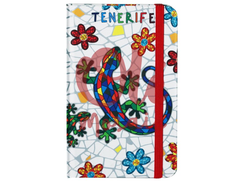 Libreta de 80 hojas decorada con una vibrante ilustración de una salamandra, inspirada en el estilo artístico de Tenerife. Destaca por su fondo blanco con un mosaico de flores multicolores, mientras que la salamandra luce un colorido patrón geométrico en rojo, verde y azul. Con una práctica banda elástica roja, esta libreta es perfecta para tomar apuntes, hacer bocetos o guardar recuerdos de la isla, combinando funcionalidad con un atractivo visual distintivo.