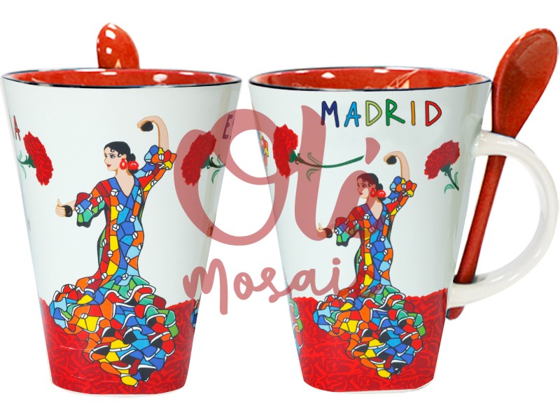 Taza de cerámica con una vibrante ilustración de una bailaora de flamenco, que representa la esencia cultural de Madrid. Esta encantadora taza en tonos beige presenta un diseño artesanal, pintado a mano, con coloridos detalles en el traje y flores rojas que adornan la escena. La palabra «MADRID» está impresa en letras alegres, complementando su atractivo artístico. Incluye una cuchara de cerámica a juego, perfecta para disfrutar de tu bebida favorita con estilo.