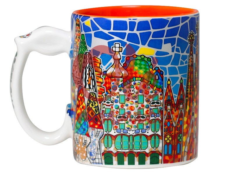 Mug de cerámica de 9,5 cm decorada con una vibrante ilustración que representa los edificios más emblemáticos de Barcelona, incluyendo motivos de la obra de Gaudí. La taza destaca por su diseño colorido, con predominio de azules y detalles en naranja en su interior. El asa tiene una forma creativa que alude a elementos arquitectónicos de la ciudad. Perfecta para disfrutar de tus bebidas favoritas mientras aprecias el arte y la cultura barcelonesa.