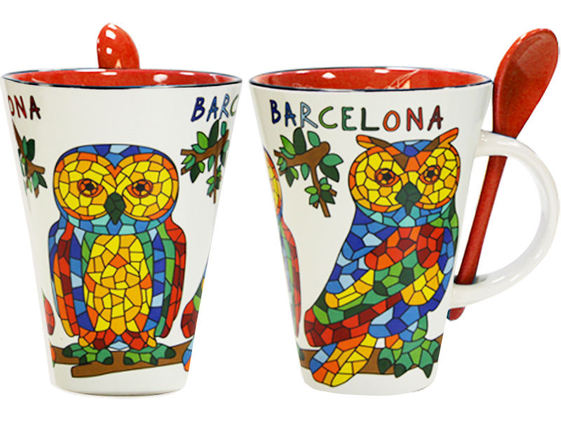 Mug de cerámica con diseño de búho, inspirado en la vibrante ciudad de Barcelona. Esta atractiva taza beige presenta una colorida ilustración de dos búhos al estilo mosaico, con tonos que van del amarillo y el azul al rojo y el verde, aportando un toque artístico. Decorada con ramas de hojas verdes y la palabra «Barcelona», es un excelente souvenir que combina funcionalidad y un diseño encantador. Incluye una cuchara a juego, ideal para disfrutar de tus bebidas favoritas.