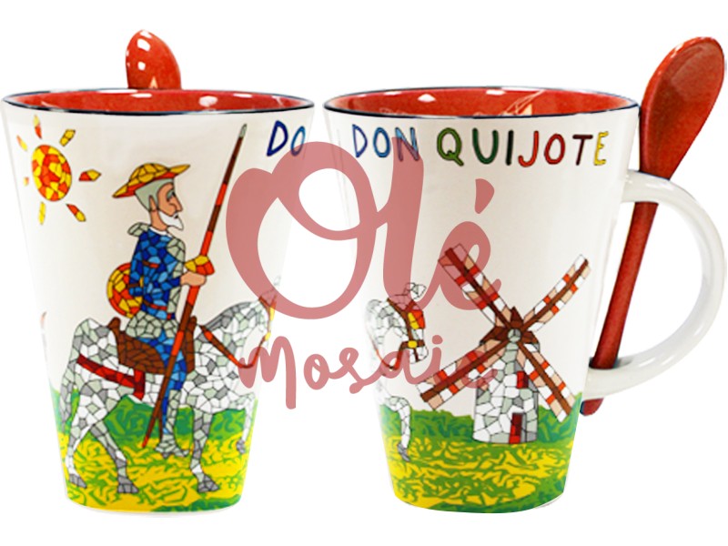 El diseño no solo cautiva por su estética, sino que también incluye una pequeña cuchara que añade funcionalidad a la pieza, haciendo de esta taza una opción ideal para el desayuno o la merienda. Este souvenir es un símbolo auténtico de la cultura española, perfecto para quienes deseen llevarse un pedacito de su historia y tradición. En Olé Mosaic entendemos la importancia de ofrecer productos que representen la diversidad cultural de España; este mug de Don Quijote es un regalo notable tanto para los amantes de la literatura como para los turistas que buscan souvenirs auténticos y de calidad. Como mayorista de artículos típicos, garantizamos la autenticidad y el carácter artesanal de cada pieza, haciendo de esta taza un recuerdo inigualable de su viaje a La Mancha.