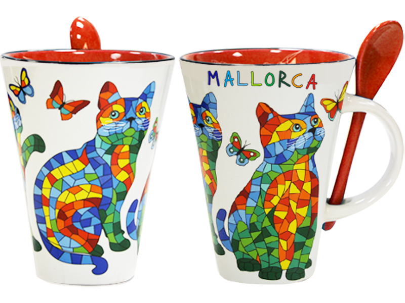 Taza de cerámica con un colorido diseño de gatos, típico de Mallorca. Esta atractiva taza, de tonalidades beige y con el interior rojo, presenta ilustraciones de gatos en un estilo mosaico vibrante, rodeados de mariposas. La palabra «MALLORCA» está pintada en colores vivos sobre su superficie, haciendo referencia a su origen. Perfecta para disfrutar de tus bebidas favoritas, es un souvenir único que captura la esencia de la isla.