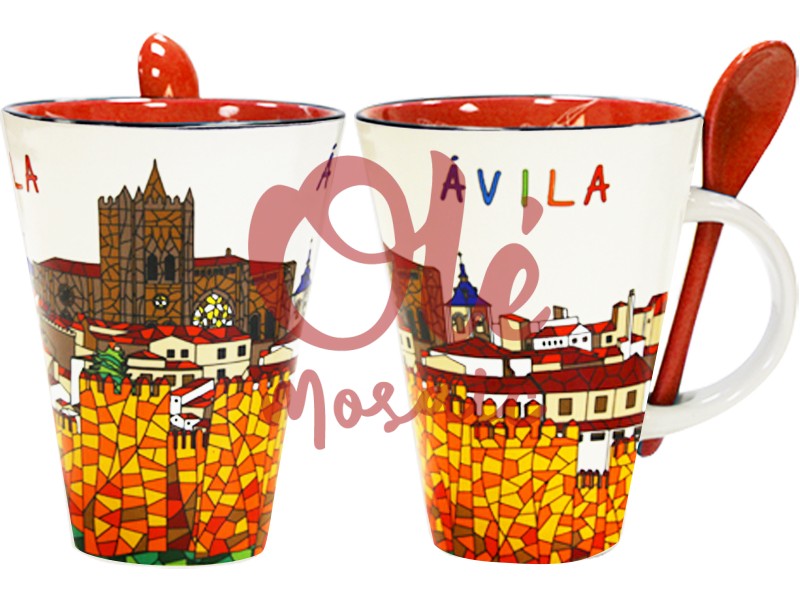 La taza cuenta con un asa de diseño cómodo y una cuchara a juego en un cálido acabado rojo, lo que la convierte no solo en un objeto funcional, sino también en un elemento decorativo para cualquier hogar. Es perfecta para disfrutar de tus bebidas calientes favoritas, como café, té o chocolate, mientras aprecias la rica historia de Ávila y su icónica arquitectura. Este souvenir es una excelente elección para turistas que deseen recordar su visita a esta gloriosa ciudad, e ideal para tiendas de regalos turísticos que busquen ofrecer productos auténticos y de calidad. En Olé Mosaic, como distribuidores de souvenirs, garantizamos que cada taza refleja la autenticidad de la cultura española, convirtiéndola en una opción imprescindible para quienes buscan recuerdos únicos.