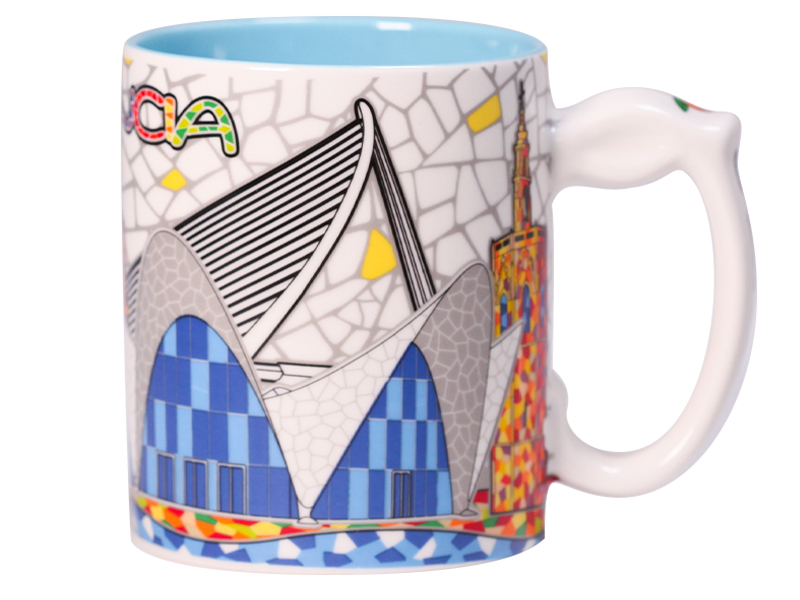 Taza de cerámica blanca inspirada en la arquitectura moderna de Valencia, con una altura de 9,5 cm. Decorada con ilustraciones del emblemático complejo de la Ciudad de las Artes y las Ciencias, presenta detalles en tonos azules y amarillos que realzan su diseño contemporáneo. El interior de la taza es azul, lo que complementa el exterior, donde se aprecian mosaicos coloridos que evocan el famoso estilo artístico de la región. Perfecta para disfrutar de tus bebidas favoritas con un toque del encanto valenciano.