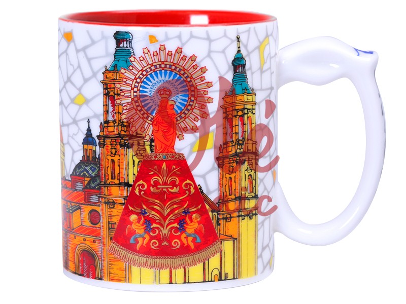Taza de cerámica decorada con la emblemática Basílica del Pilar de Zaragoza. Este mug, de 9,5 cm de alto, destaca por su fondo blanco luminoso, que contrasta maravillosamente con los vibrantes detalles que adornan su superficie. El diseño incluye la figura central de la Virgen del Pilar, con un manto rojo que resplandece, rodeada de las estructuras arquitectónicas de la basílica, todo ello representado a través de una técnica que evoca el arte del trencadís. La combinación de colores intensos y la cuidada ilustración convierten esta taza en un souvenir excepcional que captura la esencia de la cultura zaragozana.