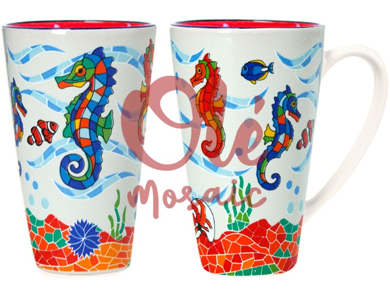 Mug XL de cerámica decorada con vibrantes caballitos de mar y peces, que representan la rica vida marina de las costas españolas. Este diseño artesanal presenta un fondo beige y coloridos mosaicos en tonos rojos, azules y verdes, evocando un estilo mediterráneo. Ideal para quienes aprecian la artesanía, esta taza es perfecta para disfrutar de tus bebidas favoritas y añadir un toque marino a tu colección.