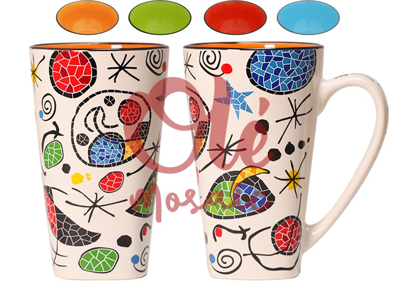 Taza XL de cerámica con un diseño colorido y moderno que evoca el estilo del arte de mosaico. Este producto presenta una base beige decorada con motivos abstractos en rojo, azul, verde y negro, creando una apariencia vibrante y contemporánea. El interior de la taza es de un cálido tono naranja que complementa su exterior. Perfecto para disfrutar de bebidas calientes, esta taza es un homenaje a la creatividad y el color, ideal para quienes buscan un toque artístico en su hogar.