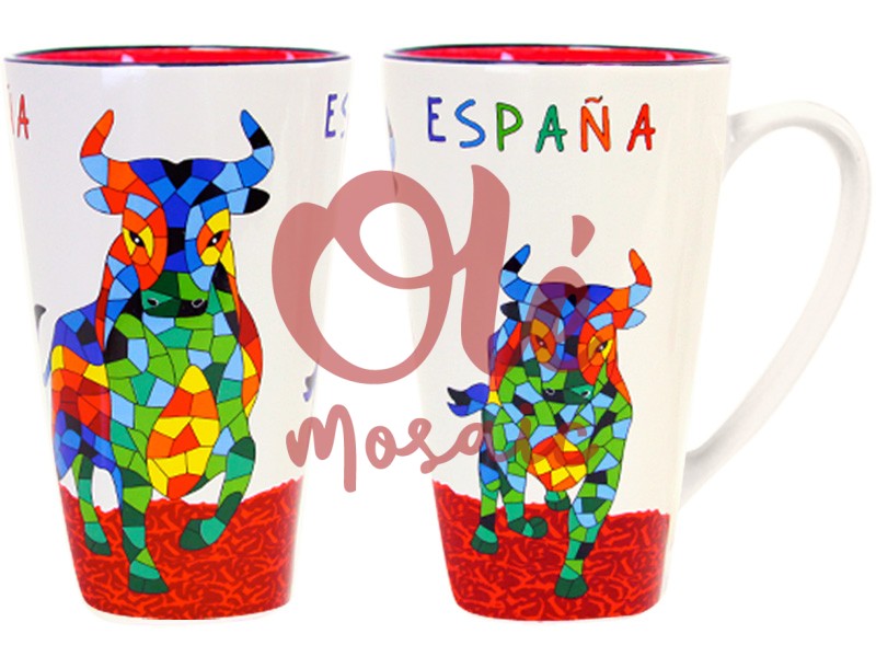 Mug XL de cerámica con diseño de toro, un símbolo de la cultura española. Esta atractiva taza presenta un colorido mosaico con dos toros en tonos vibrantes de azul, rojo, verde y amarillo, que destacan sobre un fondo blanco. La parte superior, de color beige, añade un toque elegante, mientras que el texto «ESPAÑA» en verde y rojo completa el diseño. Ideal para disfrutar de tu bebida favorita y como un llamativo recuerdo de España.