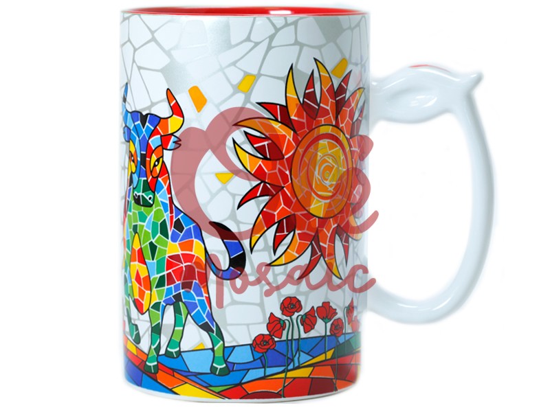 Taza XL de cerámica con un vibrante diseño taurino, símbolo de la cultura española. Con una altura de 13 cm, esta pieza destaca por su colorido mosaico que representa un toro en un paisaje adornado con un sol radiante y flores rojas. El fondo blanco resalta los vivos colores del toro, con tonos azules, verdes y rojos. Ideal para los amantes del folclore, esta taza aportará un toque artístico a cualquier cocina o colección de souvenirs.