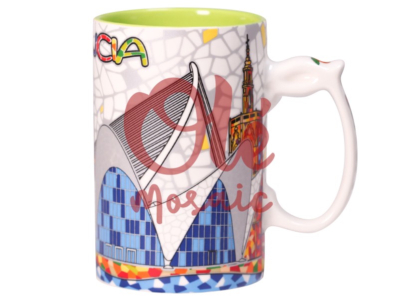 Mug XL de cerámica de 13 cm, decorado con icónicas representaciones arquitectónicas de Valencia. Este diseño colorido presenta detalles del famoso edificio de la Ciudad de las Artes y las Ciencias, resaltados por un fondo de mosaico en tonos azul y amarillo. La taza, de un atractivo blanco brillante, cuenta con un asa de forma peculiar que añade un toque original. Perfecta para disfrutar de tus bebidas favoritas mientras aprecias el arte y la cultura de Valencia.