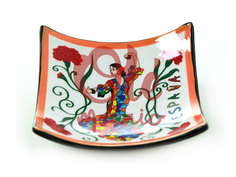 Plato de cerámica de 11 cm, decorado con la ilustración de una bailaora de flamenco. Este delicado plato, de color beige con un borde naranja, presenta una representación vibrante de una bailaora en pleno baile, rodeada de motivos florales y la palabra “ESPAÑA”. El diseño incluye detalles pintados a mano, lo que le da un toque artístico y auténtico, convirtiéndolo en un recuerdo perfecto de la cultura española y un elemento decorativo único.