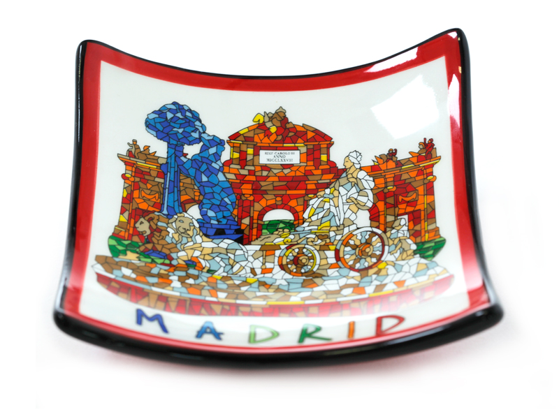 Plato de cerámica de 11 cm con una preciosa panorámica de Madrid. Este plato presenta una colorida ilustración en estilo mosaico, destacando la emblemática Puerta de Alcalá y elementos representativos de la ciudad. Con fondo beige y bordes rojos, es una pieza diseño artesanal, pintado a mano, que combina detalles artísticos con la esencia cultural madrileña. Ideal como elemento decorativo o para uso funcional, captura a la perfección el encanto de la capital española.