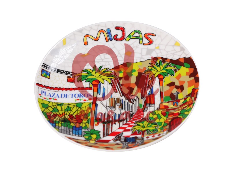 Este plato de cerámica de 15 cm es un encantador recuerdo que captura la esencia de Mijas, un pintoresco pueblo andaluz conocido por su belleza y arquitectura tradicional. Decorado con una vibrante ilustración, el plato muestra la emblemática Plaza de Toros rodeada de las características calles del pueblo, donde palmeras y detalles arquitectónicos andaluces se entrelazan en un diseño colorido y alegre. Con un fondo blanco brillante que realza los tonos vivos, el plato refleja la calidez y el carácter único de Mijas, convirtiéndolo en un excelente complemento para cualquier colección.