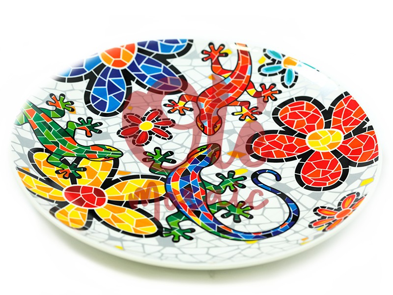 Plato de cerámica de 20 cm decorado con salamandras multicolores y flores vibrantes. Este bello plato, que destaca por su diseño en tonos rojos, amarillos, verdes y azules, captura la esencia del arte clásico español. Su superficie blanca se adorna con un patrón de trencadís, evocando un estilo moderno que recuerda las vistas frescas de la naturaleza. Ideal para exhibir en cualquier entorno, este plato combina funcionalidad y estética, convirtiéndose en un atractivo elemento decorativo.