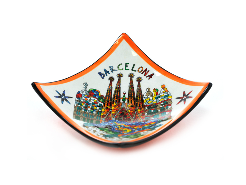 Plato de cerámica de 8,5 cm con una encantadora panorámica de Barcelona. Este elegante plato, de diseño cuadrado con bordes curvados, presenta una ilustración diseño artesanal, pintado a mano, de la icónica Sagrada Familia y otros edificios emblemáticos de la ciudad, resaltados con colores vibrantes como el rojo, el azul y el amarillo. Decorado con un borde naranja y la palabra «Barcelona», es una pieza exquisita que evoca el arte y la cultura catalana, ideal para exhibir o como recuerdo.