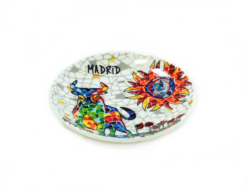 El diseño del plato es un fiel reflejo del arte popular madrileño, con la representación del toro como muestra de la pasión y el fervor que caracterizan a Madrid. El texto «MADRID» está elegantemente impreso, asegurando que este souvenir sea no solo decorativo, sino también un recordatorio significativo de la visita a esta vibrante metrópoli.