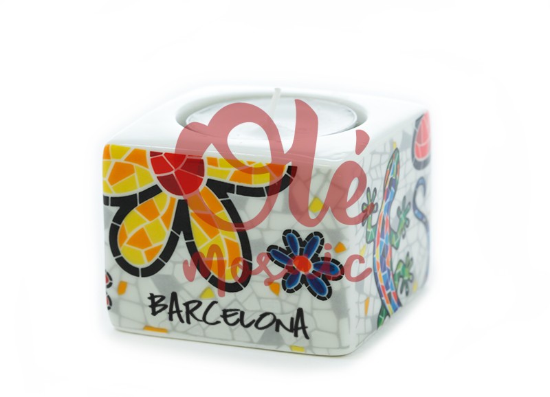 Portavelas de cerámica con un diseño colorido, inspirado en la obra de Gaudí. Representa una salamandra y flores típicas de Barcelona. Este portavelas, de acabado blanco, cuenta con detalles en mosaico en tonos brillantes como amarillo, rojo y azul, lo que aporta un toque vibrante a cualquier espacio. La palabra «Barcelona» está inscrita de manera elegante, convirtiéndolo en un recuerdo perfecto de la ciudad condal. Ideal para iluminar y decorar con estilo.