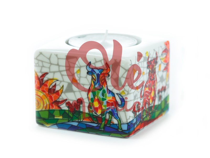 Portavelas de cerámica decorado con vibrantes motivos de toros, que representan la rica cultura española. Este elegante portavelas blanco presenta un diseño multicolor, con un toro y un paisaje floral que lo rodea, ideal para aportar un toque de color a cualquier ambiente. Su técnica de mosaico resalta los detalles artísticos y el simbolismo del toro en la tradición española, convirtiéndolo en un atractivo souvenir.