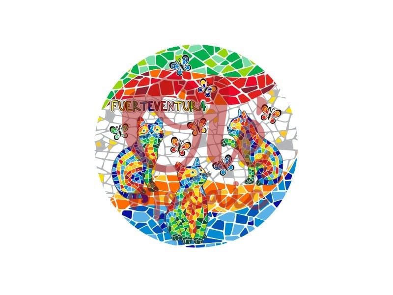 Posavasos de cerámica inspirados en los vibrantes gatos de Fuerteventura. Este artículo combina un diseño colorido y alegre con una técnica de mosaico que destaca su singularidad. La decoración incluye tres gatos estilizados en tonos brillantes de azul, verde y naranja, acompañados de mariposas multicolores. En la parte superior, el texto «FUERTEVENTURA», en letras llamativas, aporta un toque adicional a este original souvenir que captura la esencia festiva de la isla.