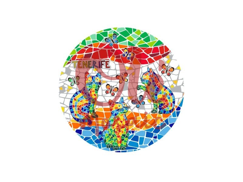 Posavasos de cerámica con un diseño vibrante de gatos, inspirado en la flora y fauna de Tenerife. Este atractivo posavasos presenta un colorido mosaico con tres gatos en tonos brillantes de verde, azul y naranja, acompañados de mariposas sobre un fondo vivo que evoca la isla canaria. La palabra «Tenerife» está estampada con una tipografía alegre, lo que añade un toque distintivo y divertido a este práctico souvenir. Ideal para dar un toque de color a cualquier mesa.