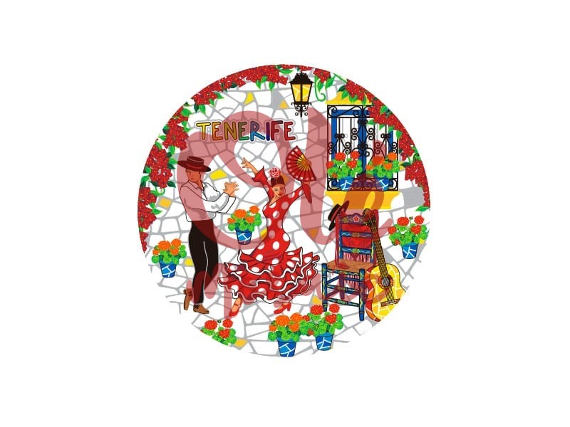Posavasos de cerámica decorado con un vibrante diseño inspirado en el folclore tinerfeño. Muestra a una pareja de bailarines en un colorido patio adornado con flores, que captura la esencia festiva de Tenerife. El fondo, que recuerda a un mosaico, resalta los vivos colores de las macetas y un farol, mientras que el texto «Tenerife» añade un toque distintivo. Ideal para dar un carácter auténtico a cualquier mesa.