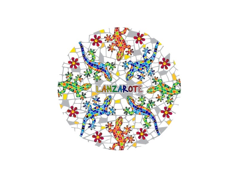 Posavasos de cerámica con un diseño vibrante inspirado en la fauna de Lanzarote. Este atractivo posavasos presenta numerosas salamandras en tonos azules, verdes y rojos sobre un fondo de mosaico. Destacan elementos decorativos de flores de colores brillantes, junto con el texto «LANZAROTE». La técnica de cerámica diseño artesanal, pintado a mano, garantiza una pieza única que capturará la esencia colorida de esta isla canaria, ideal para añadir un toque distintivo a tu hogar.
