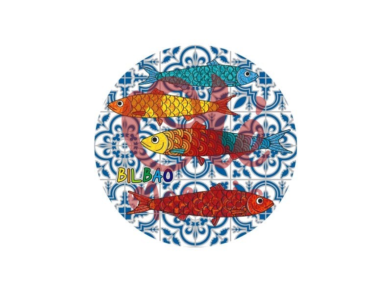 Este posavasos de cerámica es un auténtico homenaje a la tradición pesquera de Bilbao, ideal para quienes buscan un souvenir que combine funcionalidad y arte. Su diseño circular presenta un vibrante fondo de azulejos en tonos azules y blancos que evoca la rica herencia cultural de la región. En el centro, destacan cuatro sardinas ilustradas en colores vivos como rojo, amarillo y verde, cada una con un intrincado patrón que resalta la calidad artesanal del producto. La palabra «BILBAO» está impresa de forma juguetona, añadiendo un toque distintivo que lo convierte en un recuerdo memorable.