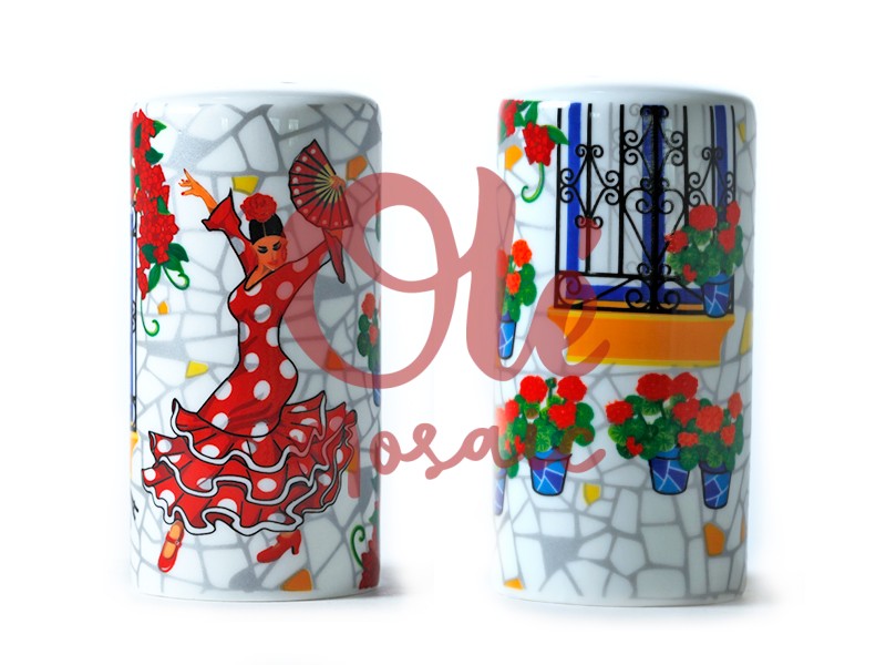 Saleros de cerámica decorados con imágenes vibrantes que evocan el espíritu de un patio andaluz. Uno de los saleros muestra a una bailaora de flamenco vestida con un vestido de lunares rojos, mientras que el otro ilustra un balcón con flores rojas en macetas azules. Ambos diseños están elaborados en cerámica blanca con acabado brillante, y destacan por sus detalles pintados a mano que añaden un toque auténtico y cultural. Ideal para darle un toque español a tu mesa.
