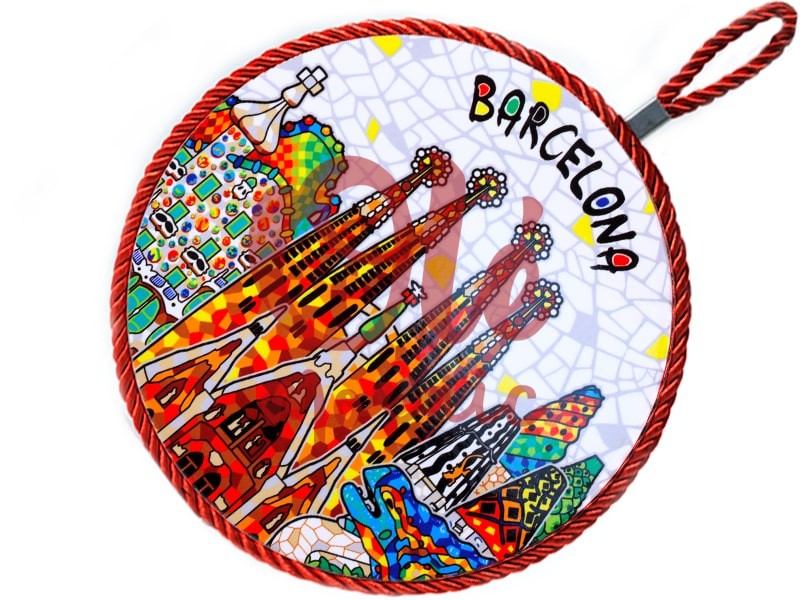 Salvamanteles de cerámica inspirados en la vibrante arquitectura de Barcelona. Este producto presenta una colorida ilustración de la Sagrada Familia junto con otros monumentos emblemáticos, capturando la esencia del modernismo catalán. Su diseño incluye detalles de mosaico, con tonos brillantes de rojo, verde y azul que evocan el estilo distintivo de Gaudí. Equipado con un práctico cordón para colgar, es un complemento ideal para cualquier cocina o mesa.