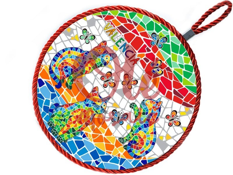 Salvamanteles de cerámica inspirado en la vibrante cultura de Valencia, adornado con un diseño colorido de gatos. La técnica de mosaico que lo caracteriza presenta un juego de formas y colores brillantes, con tres gatos en tonos azules, verdes y naranjas rodeados de mariposas que le dan un toque lúdico. Destaca la palabra «VALENCIA», que resalta sobre un fondo blanco en un estilo contemporáneo, ideal para dar un toque especial a la mesa.