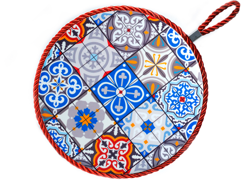 Salvamanteles de cerámica con un precioso diseño de mosaico inspirado en la tradición azulejera española. Este artículo de cocina presenta una vibrante combinación de colores, con azules, rojos y grises, y está rematado con un borde trenzado en rojo que le da un toque artesanal. Perfecto para proteger tus superficies y, al mismo tiempo, añadir un elemento decorativo a tu mesa, este salvamanteles es un recuerdo encantador de la cultura española.