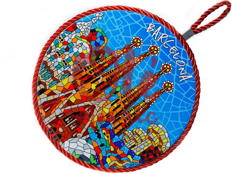La Sagrada Familia, uno de los monumentos más representativos del modernismo catalán, se alza majestuosa en esta ilustración, mientras que otras obras maestras de la ciudad también se entrelazan en este diseño cautivador. Este salvamanteles es el souvenir perfecto para quienes desean llevarse un pedazo de Barcelona a casa, evocando la rica cultura y la historia arquitectónica de la región. En Olé Mosaic, como distribuidores de souvenirs de calidad, ofrecemos este salvamanteles de cerámica como una excelente opción para tiendas de regalos turísticos, ideal para quienes buscan artículos auténticos y representativos de la rica herencia cultural de Barcelona.