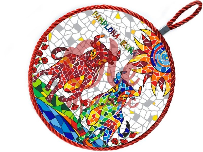 Salvamanteles de cerámica decorado con un diseño vibrante inspirado en los famosos toros de Pamplona. Esta pieza presenta un colorido mosaico con imágenes de toros en tonos rojos y verdes, rodeados de flores y un sol radiante sobre un fondo con detalles grises. Ideal para añadir un toque festivo a la mesa, es un excelente recuerdo de las populares fiestas de San Fermín y de la cultura navarra.
