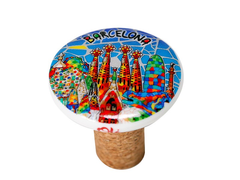 Tapón de cerámica ilustrado, inspirado en la vibrante arquitectura de Barcelona. Este encantador tapón presenta una colorida representación de la Sagrada Familia y el Parque Güell, destacando los característicos mosaicos en tonos azules, rojos y verdes. Con un acabado pulido y un corcho natural en la base, es ideal para sellar botellas con estilo y llevar un pedacito de la cultura catalana a tu hogar. La palabra «Barcelona» aparece destacada, añadiendo un toque distintivo.