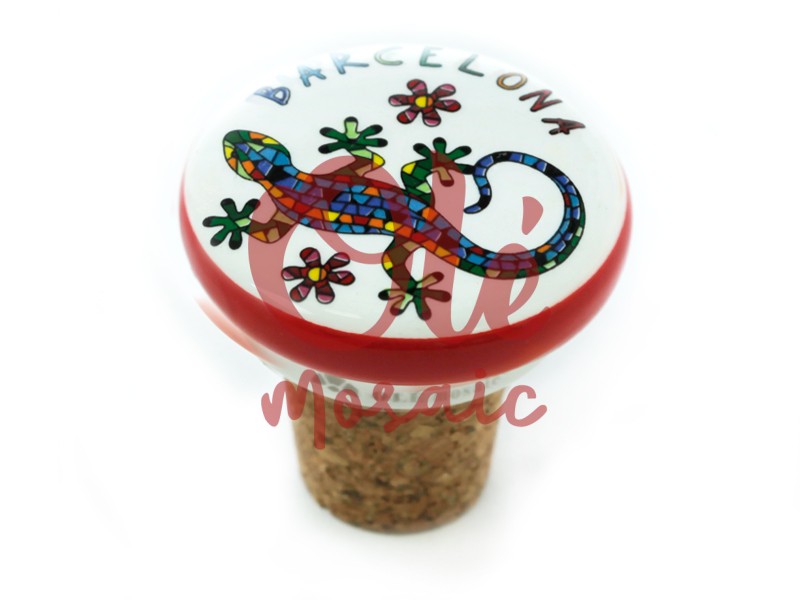 Tapón de cerámica decorado con una colorida salamandra, inspirado en el arte de mosaico de Barcelona. Este producto presenta un diseño vibrante con una salamandra en tonos azules, verdes y amarillos, rodeada de flores rojas y verdes sobre un fondo blanco. El borde del tapón es de un atractivo color beige. Además de ser funcional, la pieza añade un toque distintivo y cultural a cualquier botella, convirtiéndola en el recuerdo perfecto de la ciudad.