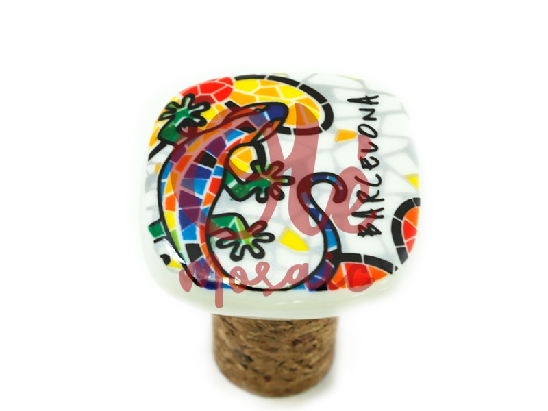 Tapón de cerámica decorado con una colorida salamandra y flores, que representa la esencia única de Barcelona. Este elegante tapón, de base cuadrada en color blanco, presenta un vibrante diseño de mosaico en tonos rojos, amarillos y verdes, evocando la famosa obra de Gaudí. La inscripción «Barcelona» añade un toque auténtico, convirtiéndolo en un souvenir ideal para quienes desean llevar un pedacito de la ciudad a sus hogares.