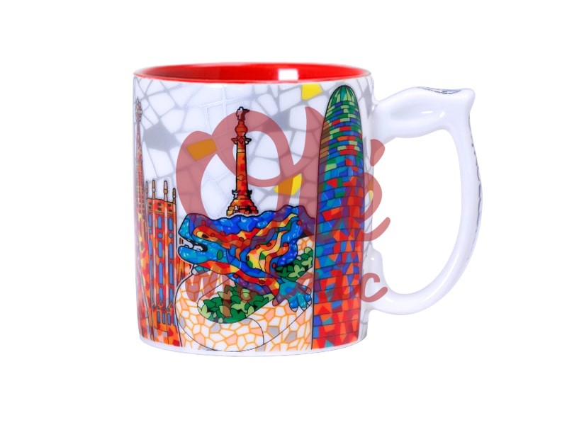 Descubre nuestra colorida taza de cerámica decorada con elementos icónicos de Barcelona, una excelente opción para quienes buscan un souvenir representativo de esta vibrante ciudad. Este diseño exclusivo presenta un mosaico vibrante inspirado en la obra del famoso arquitecto Antoni Gaudí, donde se capturan elementos emblemáticos como la estatua de la fuente de Montjuïc, el colorido dragón del Park Güell y la moderna Torre Agbar. El fondo blanco realza la vivacidad de los colores, mientras que el interior rojo aporta un atractivo contraste que otorga un toque moderno y fresco al producto.