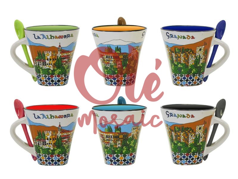 Taza de cerámica decorativa inspirada en la Alhambra de Granada, con un elegante acabado en tonos beige. Esta colorida taza presenta ilustraciones vibrantes del icónico palacio y sus jardines, con detalles en azul y motivos geométricos en la base. Incluye una cuchara a juego, del mismo color que la parte superior, que le aporta funcionalidad y estilo. Perfecta para disfrutar de tus bebidas favoritas mientras recuerdas la belleza de uno de los monumentos más emblemáticos de España.