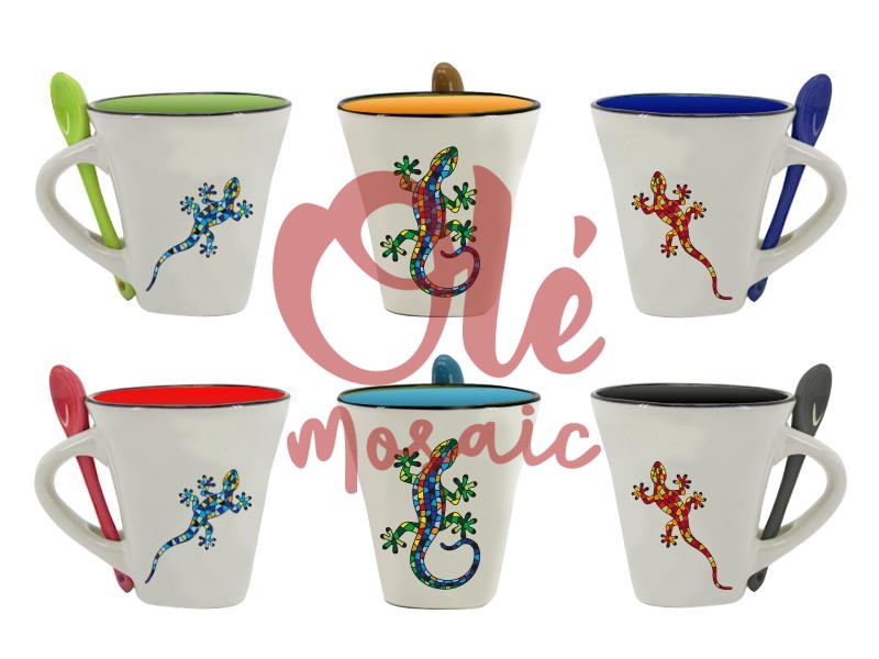 Taza de cerámica con diseño de salamandra, ideal para disfrutar de tu bebida favorita. Esta taza, de un suave tono beige, presenta una colorida salamandra diseño artesanal, pintado a mano, rodeada de hojas vibrantes. El diseño destaca por su técnica artesanal y los detalles en mosaico, que evocan el folclore español. Disponible con el asa y el interior en diferentes colores, esta taza no solo es funcional, sino también un hermoso elemento decorativo para cualquier hogar.