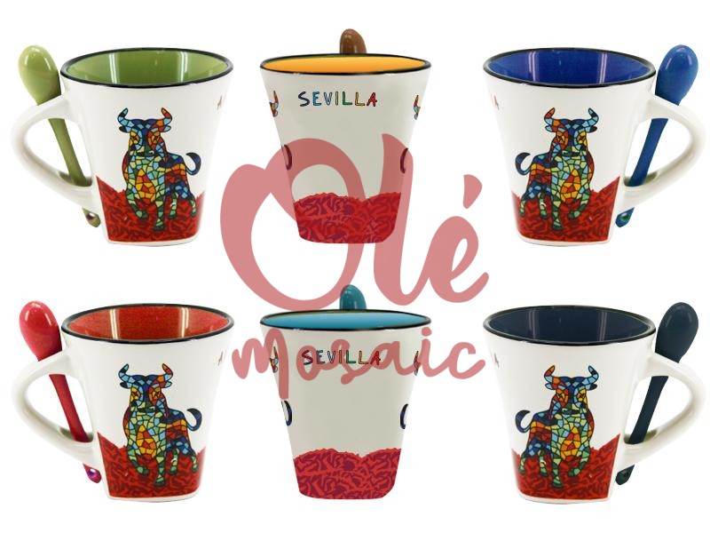 Taza de cerámica decorativa que rinde homenaje a Sevilla, con un diseño vibrante de un toro en mosaico de colores. Sobre un fondo beige, luce la palabra «SEVILLA» en la parte superior, enmarcada por un borde rojo con detalles distintivos. La taza incluye una cuchara a juego, con el asa de un elegante color, y está acabada con técnicas de diseño artesanal, pintado a mano, lo que la convierte en una pieza única y auténtica. Ideal para disfrutar de una deliciosa taza de café o té mientras se aprecia la rica cultura andaluza.